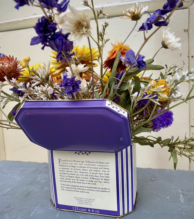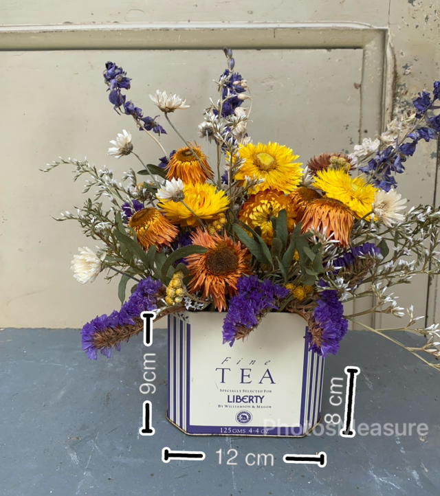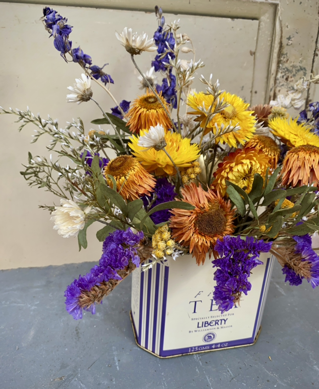 This is a one off arrangement of purple, orange and yellow focal dried flowers surrounded by soft white and eucalyptus foliage in a rustic vintage Liberty tea tin.