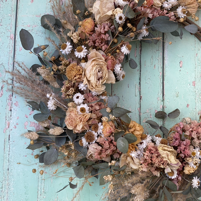A hand-tied dried floral wreath in soft blush tones, secured with natural jute string on a hazel wreath base. Designed with a gentle mix of peach statice and ranunculus, complemented by tiny daisy-style flowers, eucalyptus, and delicate grasses. Subtle textures and muted hues create a calm, romantic piece that suits both modern and rustic interiors.